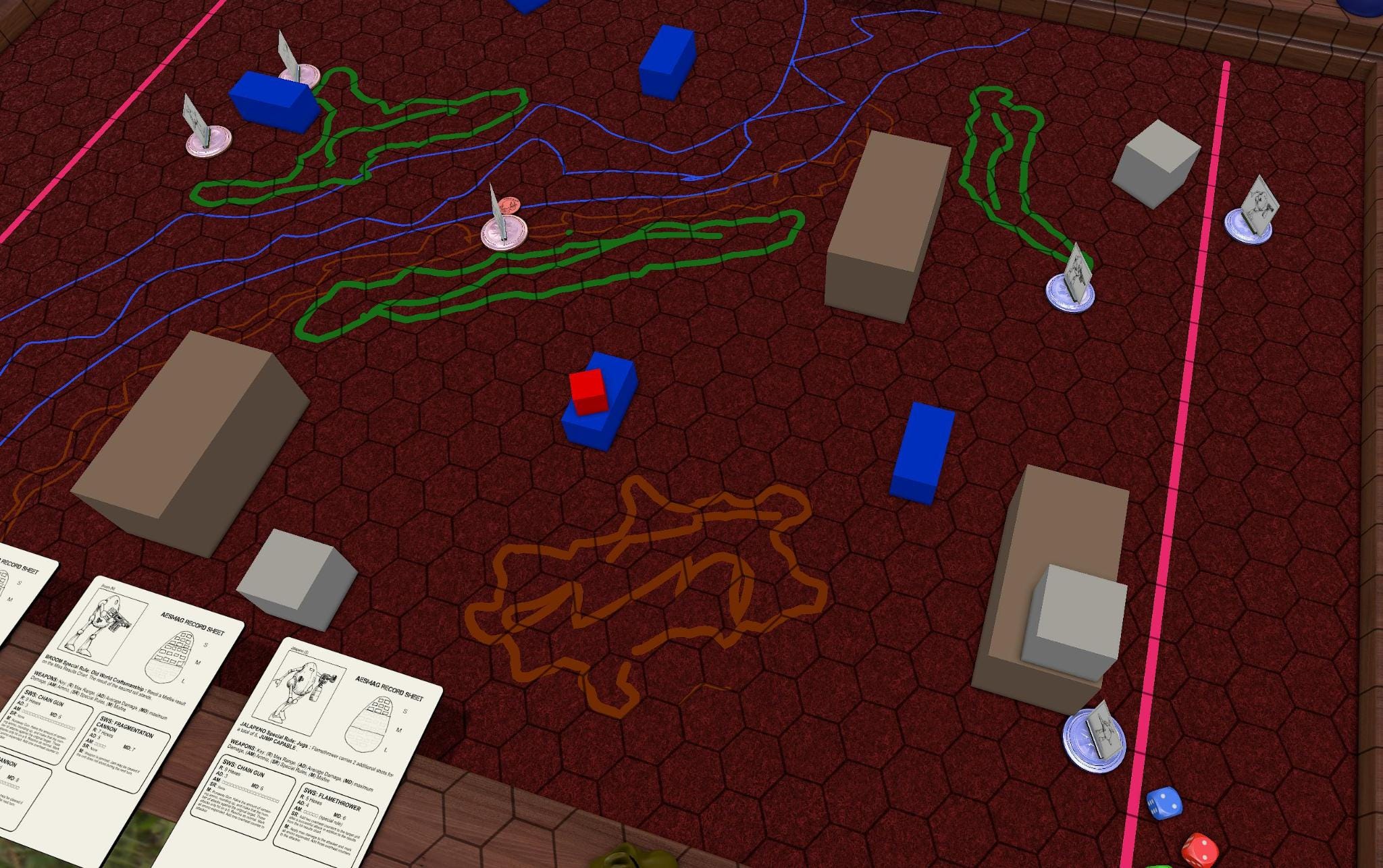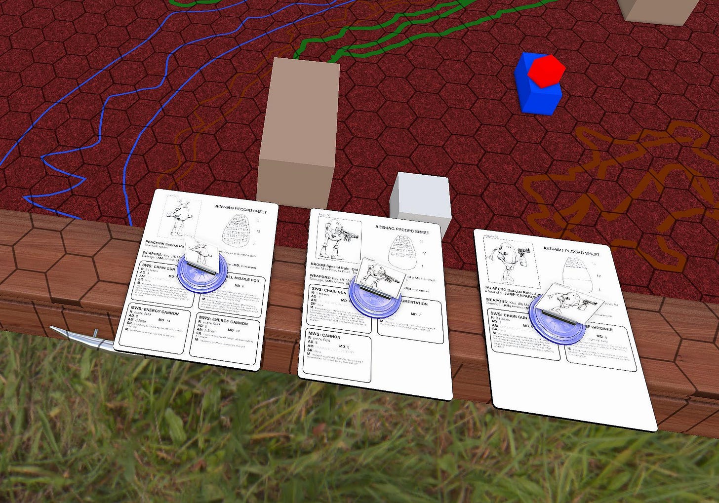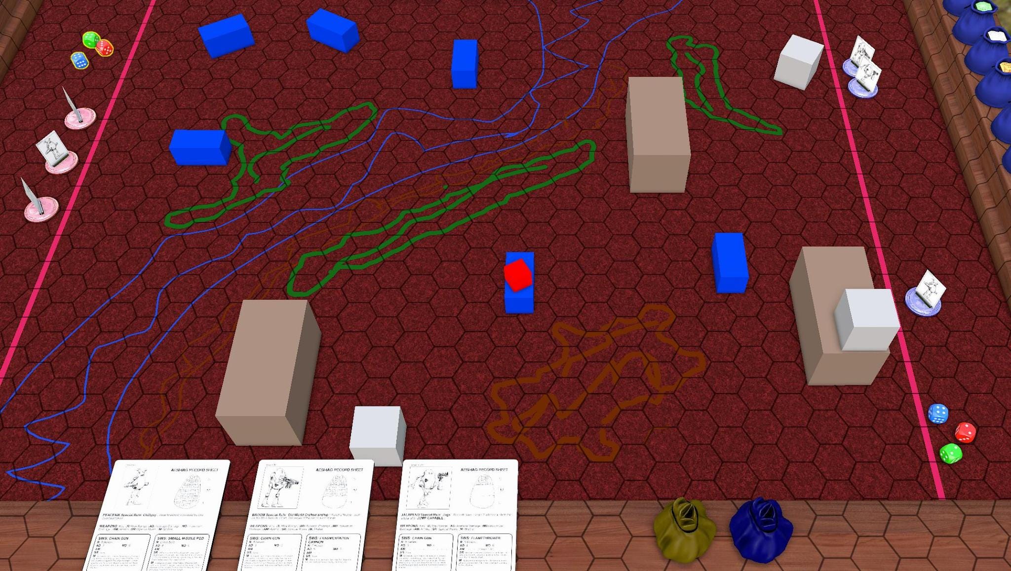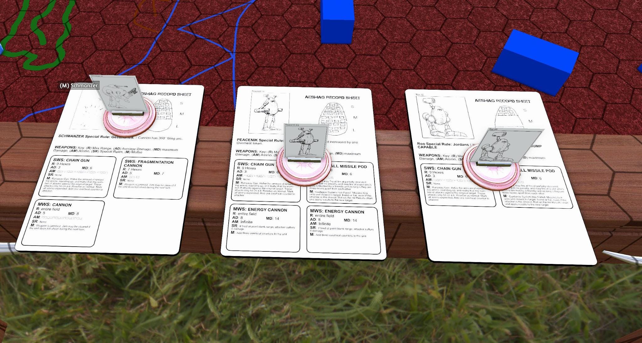 With the first set of turns done, we’re taking a pause. The broom managed to completely screw up shooting at the red ‘roo, and lost all of its chaingun ammo. The ‘roo in the meantime badly dinged up the jalapeno. Also, after chatting with the creator of the TTS module, they intend to provide an example terrain key, and also moved/shot chits that were overlooked. One feature of AESMAG is that there are not a lot of rules in place for terrain, but the basic language of rough terrain, and partial and full blocking of LOS allows for a lot of flexibility out of whatever is crafted. They also hope to have tiles and or more options / models available to place terrain on the table.
