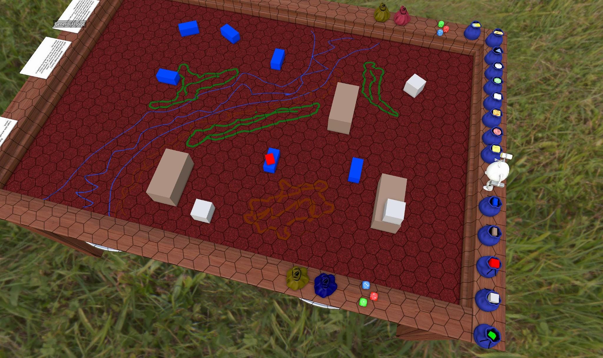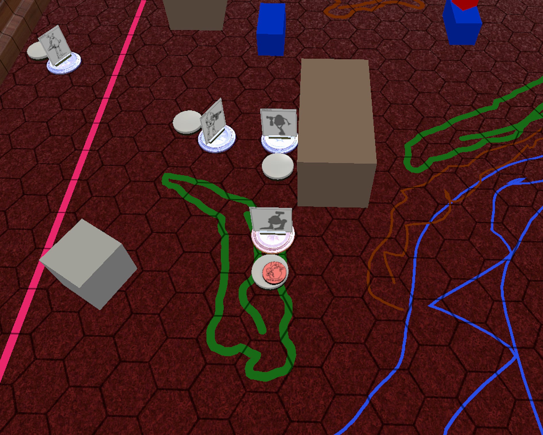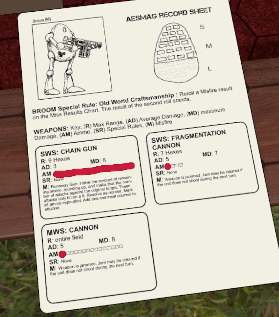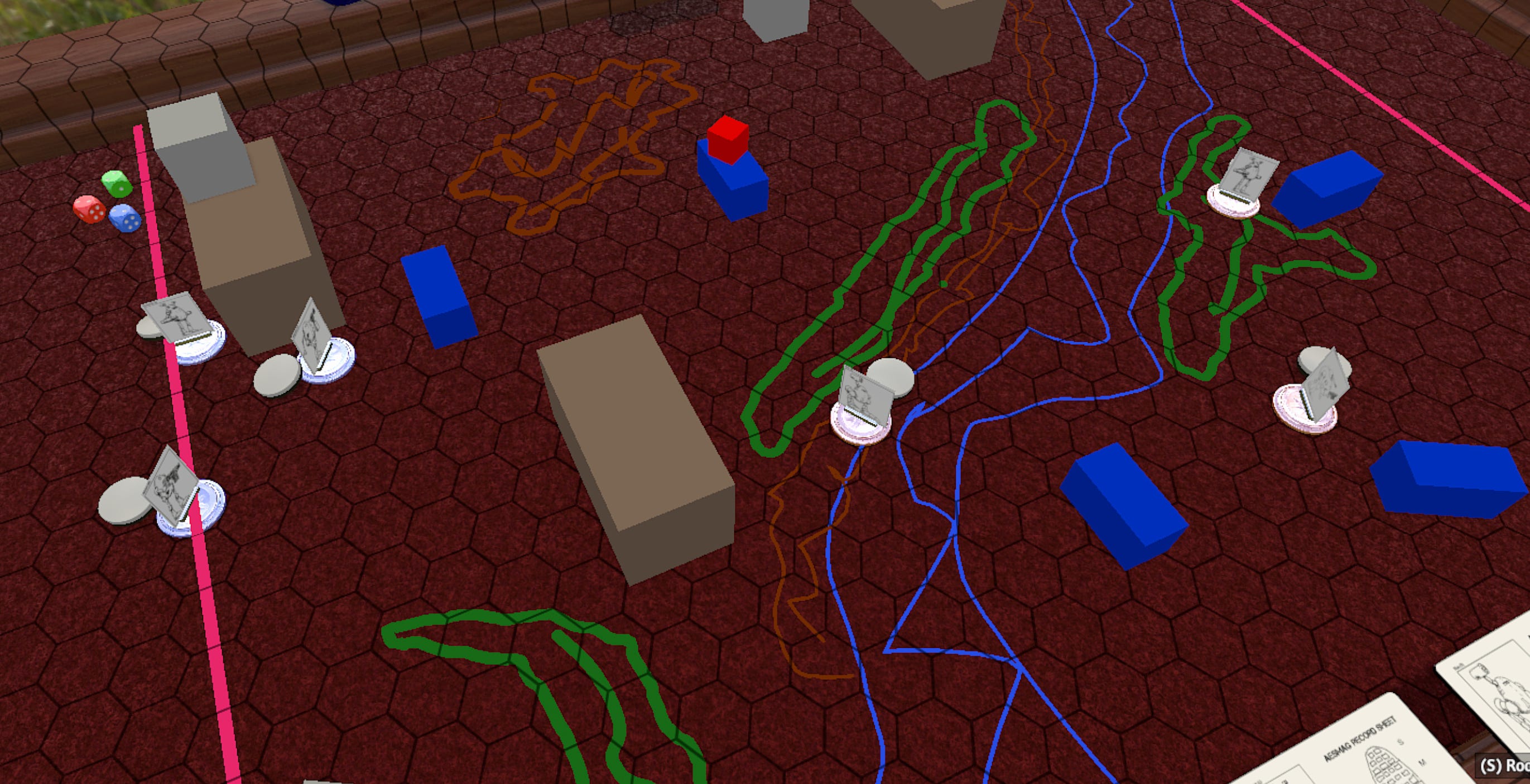 With the first set of turns done, we’re taking a pause. The broom managed to completely screw up shooting at the red ‘roo, and lost all of its chaingun ammo. The ‘roo in the meantime badly dinged up the jalapeno. Also, after chatting with the creator of the TTS module, they intend to provide an example terrain key, and also moved/shot chits that were overlooked. One feature of AESMAG is that there are not a lot of rules in place for terrain, but the basic language of rough terrain, and partial and full blocking of LOS allows for a lot of flexibility out of whatever is crafted. They also hope to have tiles and or more options / models available to place terrain on the table.