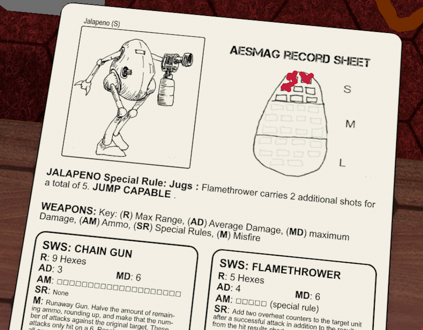 As a note, we’re using regular damage so each square is “x”’d out, meaning the 6 points of max damage from the small missile pod only cross out three squares. Otherwise, that Jalapeno would be in even more dire straights.