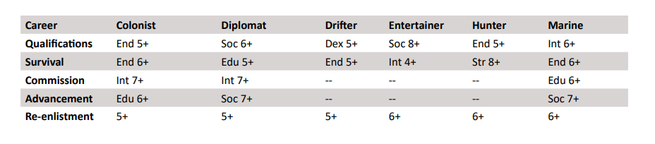 There is an expansion of careers. Instead of the basic 6 of CT, we've massively expanded what used to be the "other" option as well as split out some of the military services in a more granular fashion for a total of 24 possible career paths. You can be an Agent, a Diplomat, a Belter, work in Maritime Defense, be a scientist, or even a technician, among other things. You can also just be a Noble, doing Nobleman things. Each of these careers has a short matrix for enlistment, survival, rank advancement, and re-enlistment options, as well as tables for rank, service skills, mustering out benefits, and so forth.